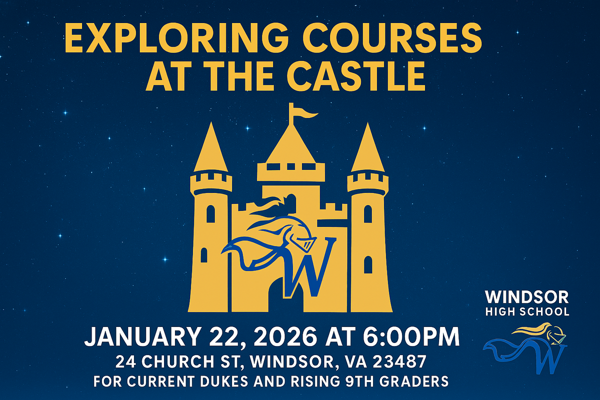 Join us at Windsor High School for “Exploring Courses at the Castle” on Thursday, January 22, 2026, at 6:00 PM. Families are invited to discover the exciting opportunities available at WHS, including electives, Advanced Placement, and Dual Enrollment courses. The event will begin at 6:00 in the auditorium. Afterwards, teachers will be on hand to answer questions and share insights about their classes. All rising 9th graders and current students are invited to attend to learn more about available courses prior to scheduling classes for the 2026-2027 school year. Don’t miss this chance to learn more and prepare for a successful high school experience!